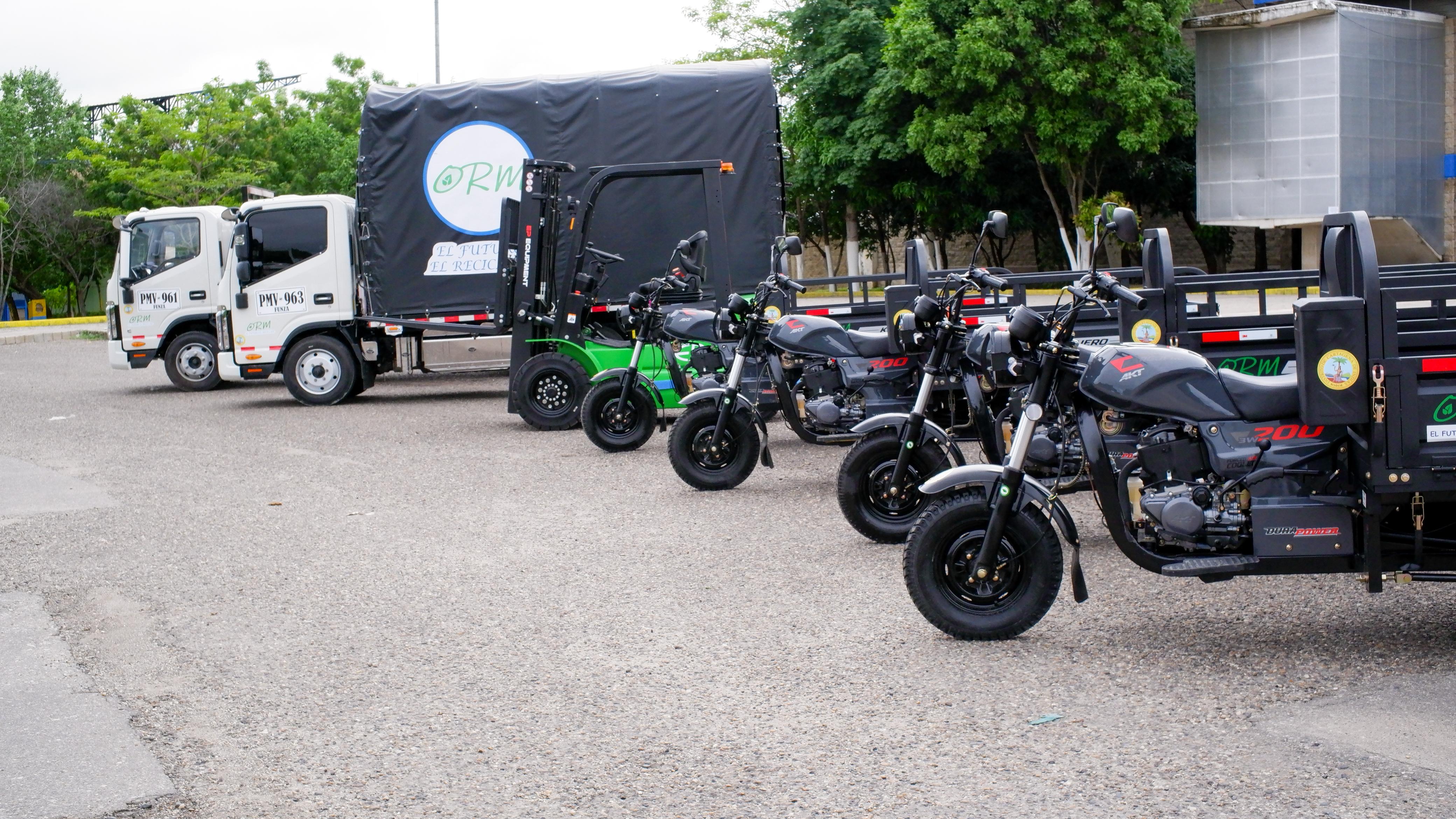ORM SAS ESP para la prestación del servicio de aseo en su actividad de aprovechamiento cuenta con, 2 camiones de 5 y 3 toneladas de capacidad, así como, con 4 moto-cargueros de 410 de kilogramos de capacidad y 1 montacarga con capacidad de 5 toneladas.